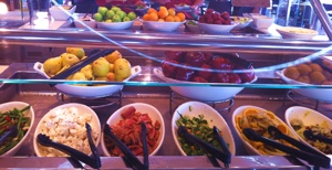 For dinner, we find the main dining room elegant and grand with three open floors, live classical music, and huge hanging chandeliers (just like in the movies). The service is impeccable. The servers not only remember my name, but how I like my water without ice at room temperature. For Thanksgiving dinner, I requested dark meat only and the waiter made a special trip to another deck to fulfill my request and then apologized for the wait!