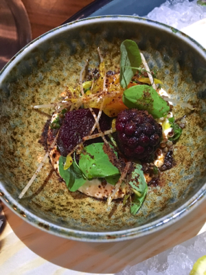 Salt roasted beets – blackberry, pea shoots, miso yogurt, dry miso, red quinoa.